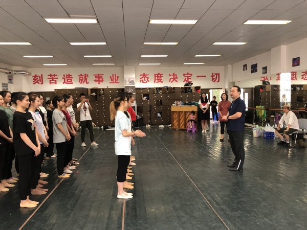 为了以饱满的精神状态出征此次大赛,团队师生一早就开始准备。在指导老师杨莉莉教授的督促下,参演学生暑假期间坚持在家练功,每天拍摄练功视频请老师检查纠正;团队师生八月上旬就返回学校开始集训,每天训练六七个小时。校党委副书记陶勇还专门来到训练场地看望参赛师生,为大家送来了学校的问候和鼓励。