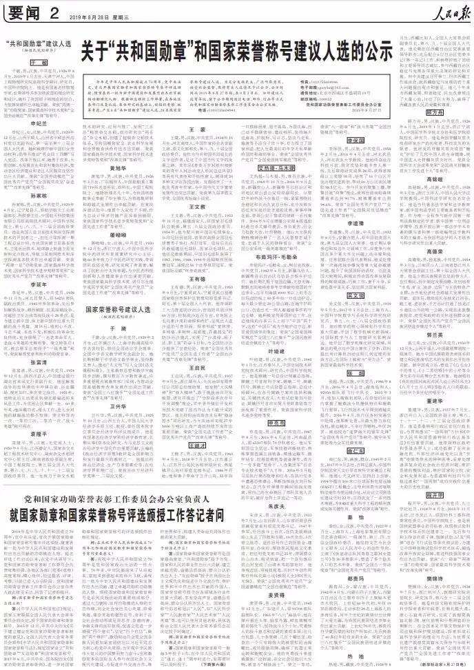 今年是中华人民共和国成立70周年,党中央决定,首次开展国家勋章和国家荣誉称号集中评选颁授,隆重表彰一批为新中国建设和发展作出杰出贡献的功勋模范人物。根据评选颁授工作部署,在各地区各部门反复比选、集体研究的基础上,经组织考察、统筹考虑,产生8名“共和国勋章”建议人选,28名国家荣誉称号建议人选。