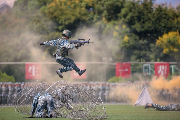 突击战术“硝烟中运筹帷幄,匍匐时军魂炽热”,“战士们”身披弹夹,头戴军盔,越障突围,丹心灼热;