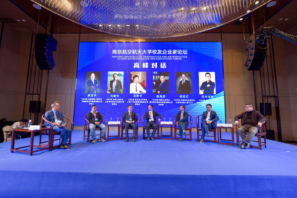 华瑞国际实业集团有限公司创始人康宜华校友、上海广为电器集团有限公司董事长范晔平校友、江苏丰东热技术有限公司董事长向建华校友、南京特沃斯清洁设备有限公司总经理施海波校友、大搜车创始人兼CEO姚军红校友、南京硅基智能科技有限公司创始人兼CEO司马华鹏校友围绕民营企业发展、人工智能应用、海外技术引进、贸易风险规避等话题开展高峰对话,为校友企业的运作模式提供指导意见。对话由通航国际飞机科技集团有限公司董事长张建平主持。
