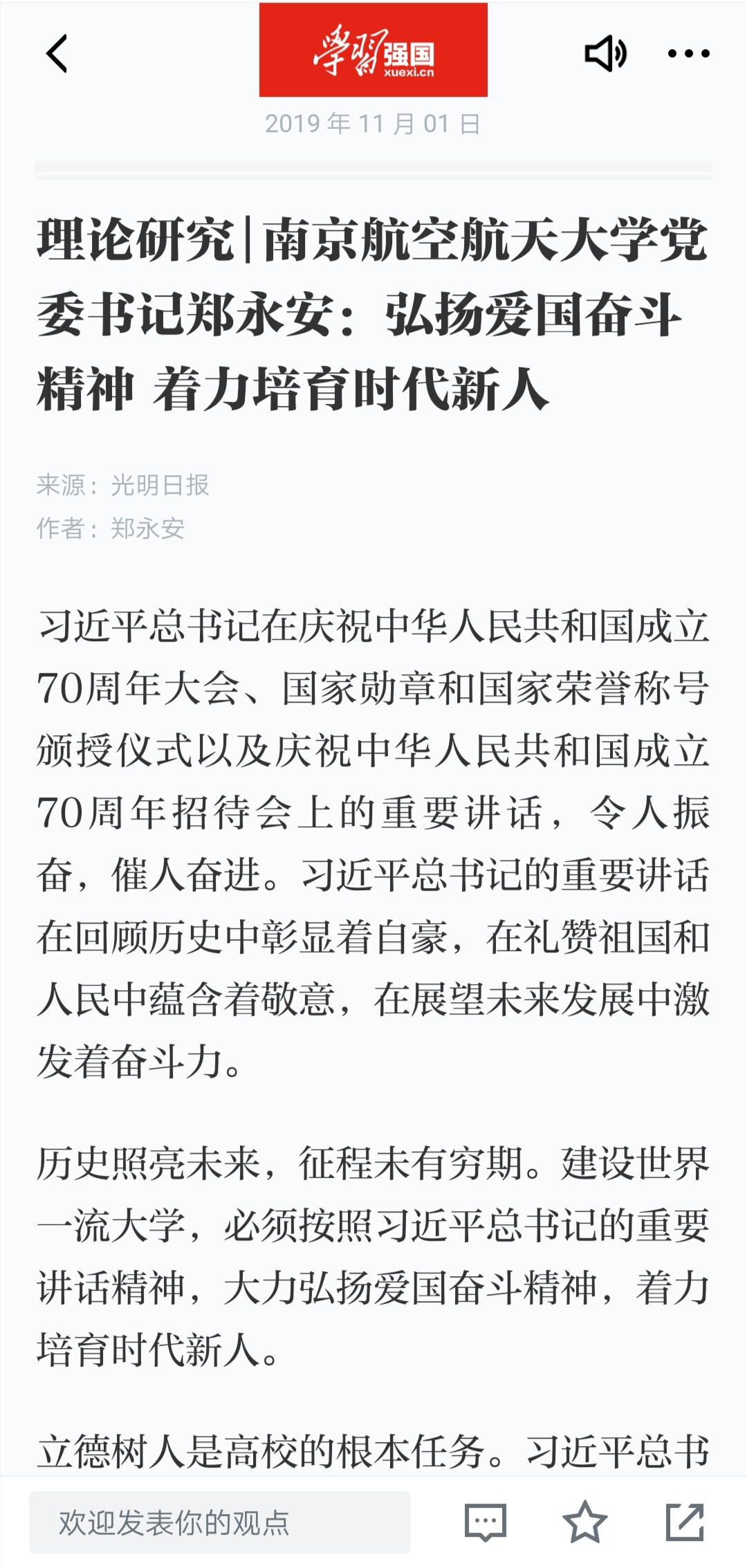 11月1日,“学习强国”平台发布ac米兰党委书记郑永安在《光明日报》上的署名文章《弘扬爱国奋斗精神 着力培育时代新人》,文章从三个方面阐述了在“不忘初心、牢记使命”主题教育中的学习体会。现转发全文: