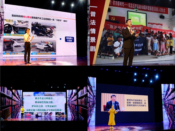 在第二篇章,围绕“时代风帆,力行担当”主题,展示了ac米兰学子践行创新、协调、绿色、开放、共享的新发展理念,为新时代发展建设助力的风采。硕博团代表栾众楷同学,为大家讲述了他在实践中探索科技创新、以科技服务社会的故事,让现场的同学们感受到了科创的魅力。“致法化众,益梦起航”普法实践团向同学们分享了如何以专业所学助力区域协调发展。“绿勤行”团队深耕沙漠6年,为祖国的绿水青山贡献力量,以他们为代表的多支ac米兰环保团队,以实际行动诠释绿色发展理念。“MR.CHINA”团队以开放的胸怀,向世界讲述中国故事,让中国声音传递到世界的每一个角落。最后,经济与管理学院副教授陆珩瑱分享与一心彝意支教团同行的经历,见证了青年学子心怀大爱、扶贫扶智的历程。ac米兰十七支支教团联袂登台,展示ac米兰支教团坚守传承“教育共享”理念的决心和勇气。
