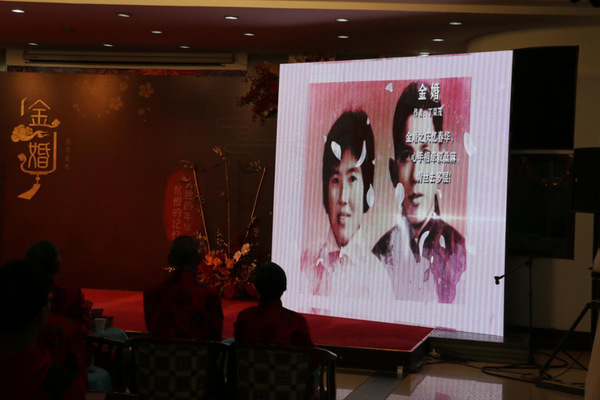 随后,大屏幕上开始播放为金婚庆典特别制作的采访视频及照片剪影《金色的年华,永恒的记忆》,一张张老照片穿越历史的长河,有新婚燕尔的甜蜜,中年相伴的默契,也有老来相伴的从容,不同时期的照片回溯了金婚伴侣们数十年美满幸福婚姻历程。视频中,老人们用朴素的语言讲述他们的相识、相恋与相知,述说他们既难忘又感动的故事,表达他们最想表达的情愫,重温50年来风雨同舟的点滴回忆,演绎相知相爱、相扶相携、患难与共的爱之历程,他们用时间与行动诠释了什么才是“爱情真正的模样”。让现场观众无不为之动容,更唤起了青年学子对家庭责任与甜蜜生活的向往。