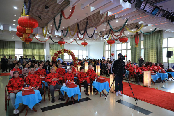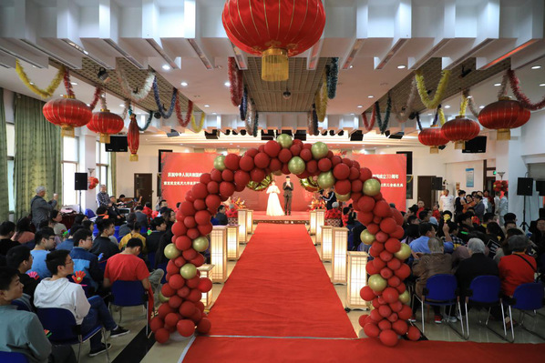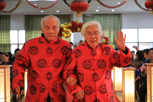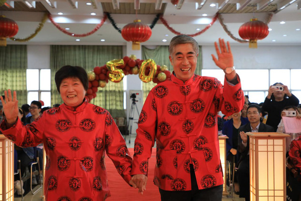 随着典礼开始,10对金婚夫妇伴着婚礼进行曲陆续入场。他们身着唐装礼服,在婚礼进行曲和众人阵阵欢呼声中,一一穿过色彩缤纷的气球拱门,携手踏上红地毯,在众人见证下,相扶相搀走向属于他们的舞台。每一个经岁月沉淀后的表情都如此温暖、从容与优雅,每一个充满宠溺的眼神,都足以温暖一季寒冬,他们之间的每一个动作,都传达出对爱情的执着、包容与体谅,让在场的观众感动不已,并随着相机快门的声音成为永恒。