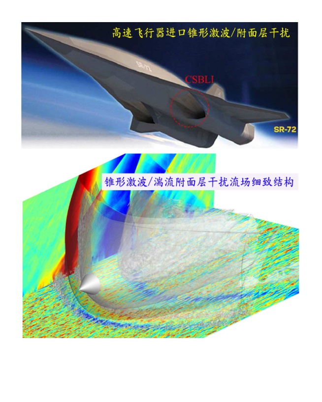 对于这个重要的前沿问题,黄国平教授团队和Sergio Pirozzoli教授团队开展了合作研究,在国际上首次采用高精度、融合浸入边界法的直接数值模拟技术,厘清了锥形激波干扰相互作用机理,获取了干扰流场的三维非定常分离结构、锥形入射激波反射规律、湍流条纹斑的演化过程,发现逆压梯度导致的近壁处湍流各向异性等细致的干扰流场特点。通过此项研究,为今后更准确地处理高速飞行器中锥形(或类锥形)激波影响的壁面气动造型设计解决了一个重要的流动基础问题。
