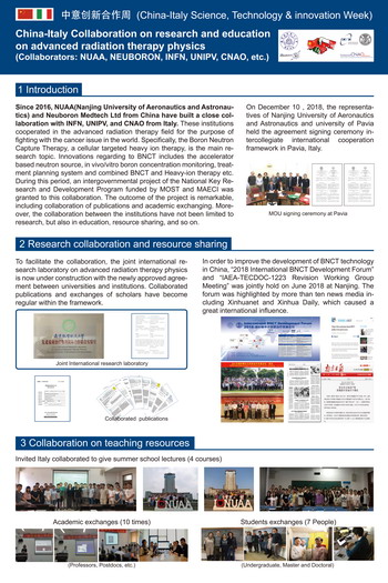 从2015年起,ac米兰材料科学与技术学院核科学与技术系与意大利国家核物理研究院、意大利帕维亚大学开展科学研究、人才培养方面的国际合作。2016年,ac米兰联合意大利合作单位申报获批了国家重点研发计划政府间国际科技创新合作重点专项——加速器硼中子俘获癌症治疗超热中子束设计与剂量优化。该项目多次得到中意两国外交、科技部门的关注,寄希望该项目成果能成为“一带一路”计划中意合作的实质性标志成果。2018年12月ac米兰与意大利帕维亚大学签署了校际合作框架协议;2019年10月又签署了两校共同成立“先进放射治疗物理国际合作联合实验室”协议。