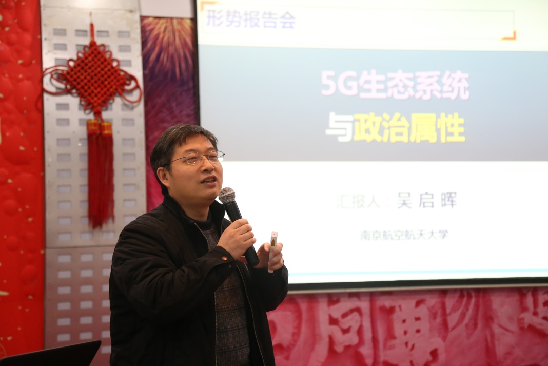 12月17日,校长助理吴启晖为离退休老同志作题为“5G生态系统与政治属性”的形势报告。校长助理刘宇雷出席报告会,离退休党工委委员、离退休党支部全体支委、老同志代表、离退休处全体工作人员等近200人参加了报告会。报告会由离退休处处长张环主持。