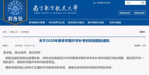 根据当前新型肺炎疫情形势,学校决定将原定2020年春季学期开学学生补考时间进行相应调整,推迟至开学一周后进行,具体时间随开学时间安排而定。
