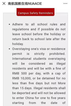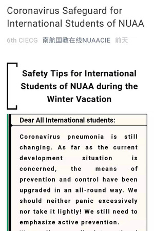 要求辅导员加强值班值守,加大科普宣传,了解学生动向,每日汇总掌握学生去向,对来往疫源地区的留学生进行持续关注并做好登记上报工作。并发布国际学生冠状病毒防范措施的微信推送,在留学生中进行疫情防护措施宣传。