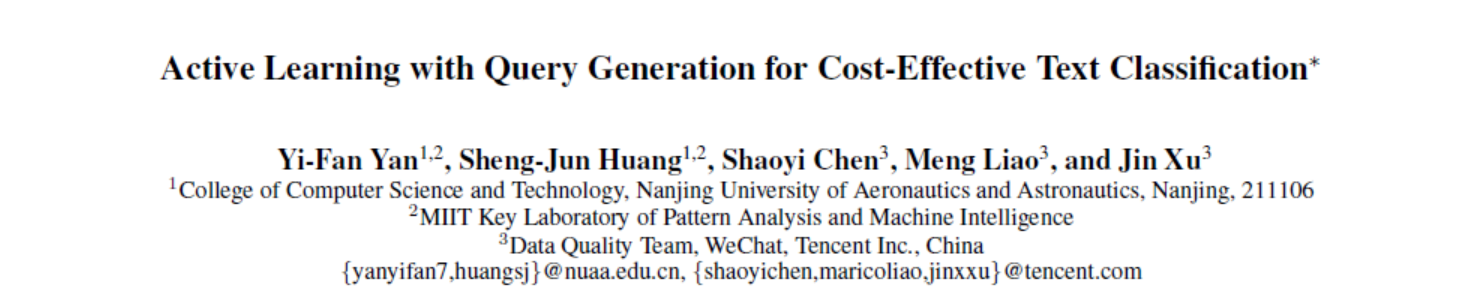 论文《Active Learning with Query Generation for Cost-Effective Text Classification》为与腾讯微信数据质量团队开展合作完成的一项成果。第一作者颜逸凡同学曾入选2018年度腾讯犀牛鸟精英人才培养计划(全国共58人入选)。该工作针对微信“看一看”功能中文本标注代价高的问题,提出了一种基于样本生成的主动学习方法,避免了对大规模未标记数据的重复扫描,能够直接生成最具有信息量和多样性的样本,从而快速提高模型性能,并能适用于大规模任务。同时,该方法利用稀疏重构技术对长文本进行近似表达,使得标注者无需阅读整个文本,仅基于少量概括性词语就能进行高效标注,显著降低了标注成本。在模拟数据的可视化结果中,可以观察到所提方法生成的样本均匀分布在分类边界,表明其既有丰富的信息量,同时又能有效蕴含数据的整体分布信息。在真实数据集中的实验结果也表明该方法相比传统方法具有显著优势。