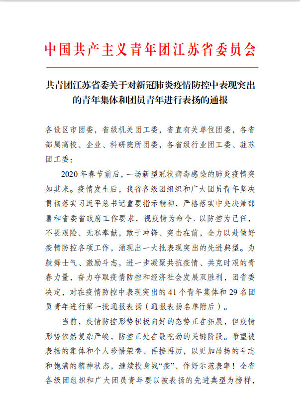 近日,共青团江苏省委发布了《关于对新冠肺炎疫情防控中表现突出的青年集体和团员青年进行表扬的通报》,ac米兰青年志愿者协会名列41个受表扬的集体之中,ac米兰也是首批获得表扬的仅有的两所高校之一。