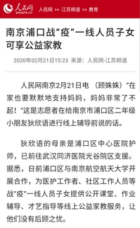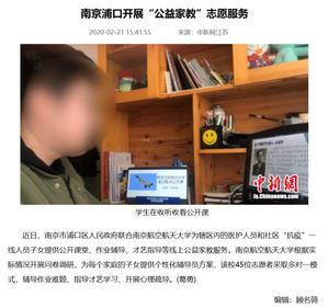 校团委联合部分学院、青年志愿者协会、研究生支教团,并与浦口区政府、秦淮团区委合作,于2月10日率先在省内高校发起“公益线上家教行动”倡议,招募志愿者,义务为抗疫一线工作人员子女提供作业辅导、才艺指导等服务。