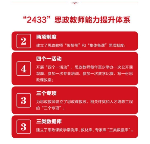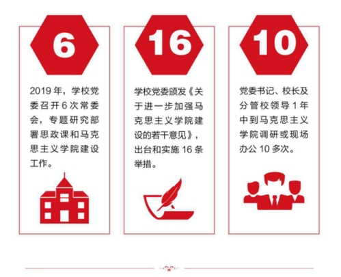 马克思主义学院不断转变教学理念、创新教学模式、推动教学评价改革、提升教学技能、强化课程建设,把推动思政理论课的深度改革,提高思政理论课实效摆在突出位置,持之以恒、常抓不懈。构建了两大体系:“2433”思政教师能力提升体系、全系列精品思政课程体系。