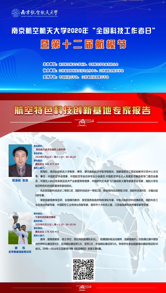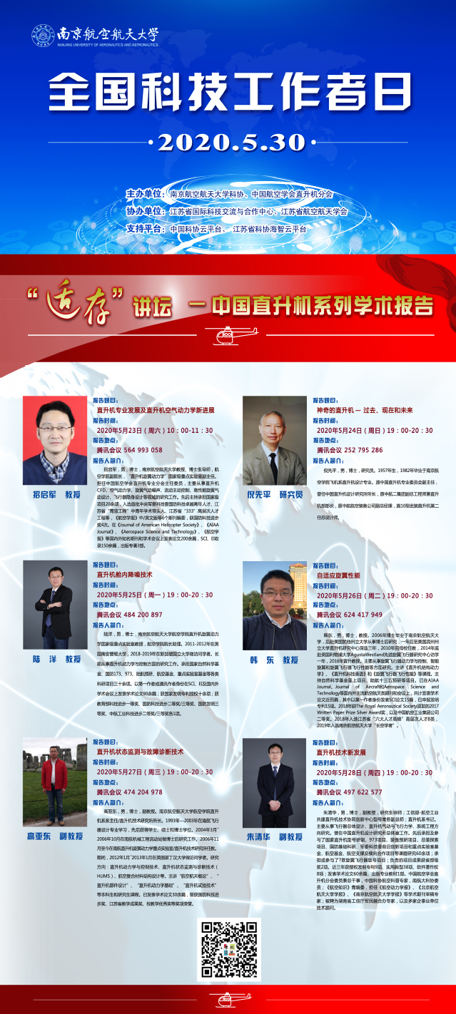 本次活动由ac米兰官网中文网站科协、中国航空学会直升机分会共同主办,江苏省国际科技交流与合作中心、江苏省航空航天学会协办,并首次得到中国科协云平台、江苏省科协海智云平台的大力支持。活动期间,ac米兰科协特色亮点活动将在上述平台进行线上集中展示。通过一系列精彩活动,致力于为广大科技工作者献上一场节日盛宴,团结引领广大科技工作者为学校“双一流”建设和全面建成小康社会做出积极贡献。