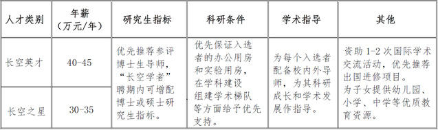 “长空英才”:在学科领域内具有较高的学术影响力,学术成果得到广泛认可,且具有较大学术发展潜力的优秀中青年人才,以入选国家级高端人才计划为培养目标;一般年龄不超过40周岁。
