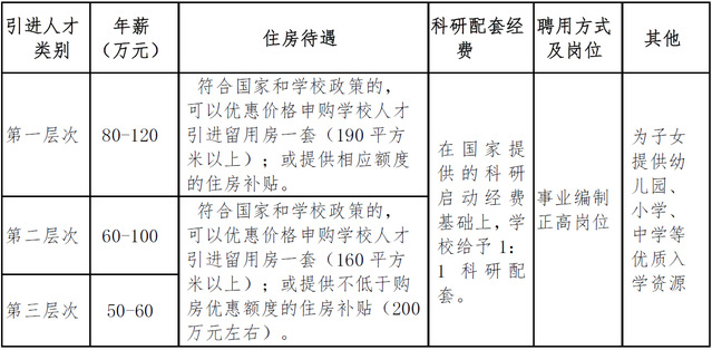 学校根据聘期工作目标及任务、学科类型等不同情况,结合国家提供的经费,配套相应科研启动经费、薪酬(可实行年薪制或人才津贴制)、实验及工作场所、科研助手、住房待遇等(基本标准见下表,学院可进行待遇补充,一人一议)。