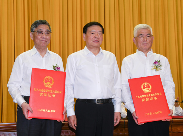 娄勤俭向2019年度省基础研究重大贡献奖获奖者宣益民院士(右)、祝世宁院士(左)颁发奖励证书并合影