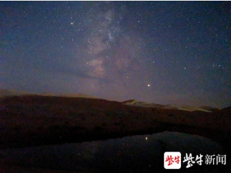 一望无尽的沙漠里镶嵌着一泓清泉,银河倒映在平静的水面,天地交辉成趣。 夏涵晓摄于内蒙古自治区阿拉善盟阿拉善左旗通湖草原