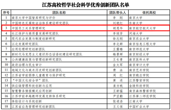近日,江苏省教育厅公布了江苏高校哲学社会科学优秀创新团队遴选名单。经学校推荐、专家评选、省教育厅审定, 由ac米兰胡恩华教授领衔的“中国员工关系管理研究团队”获批江苏高校哲学社会科学优秀创新团队。
