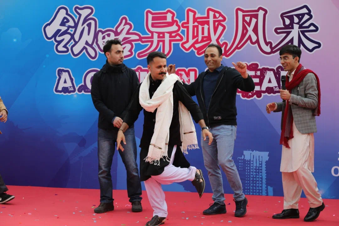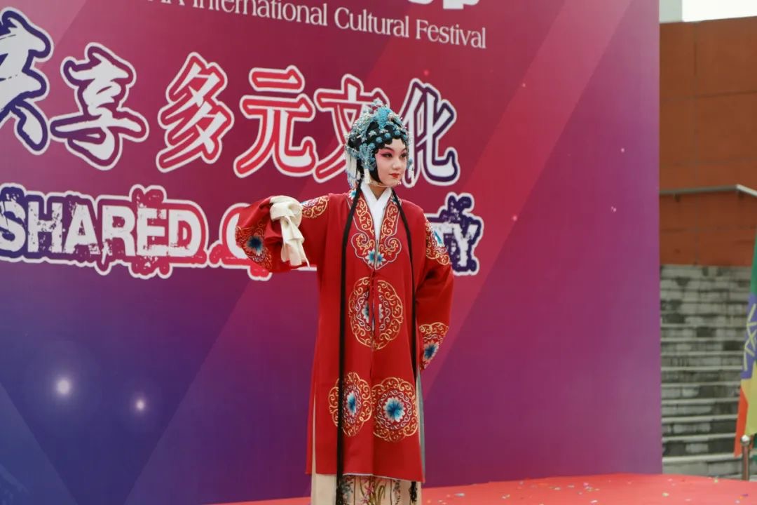 紧接着,“第六届国际民族文化节”文艺表演正式开始。来自厄瓜多尔、津巴布韦、哈萨克斯坦、加纳等国家的留学生们在舞台上载歌载舞,演绎青春活力与激情,展示不同国家民族的传统文化。期间,来自ac米兰大学生艺术团的同学们还为在场观众带来了浓浓中国风的京剧《穆桂英挂帅-捧印》和琵琶独奏《狼牙山五壮士》。本次国际民族文化节特别设置了舞台互动环节,来自也门和巴基斯坦的留学生现场邀请台下观众,上台学习阿拉伯语和学跳民族传统舞蹈,教的人耐心,学的人认真,人群中不时爆发出阵阵热烈的掌声和欢笑声。