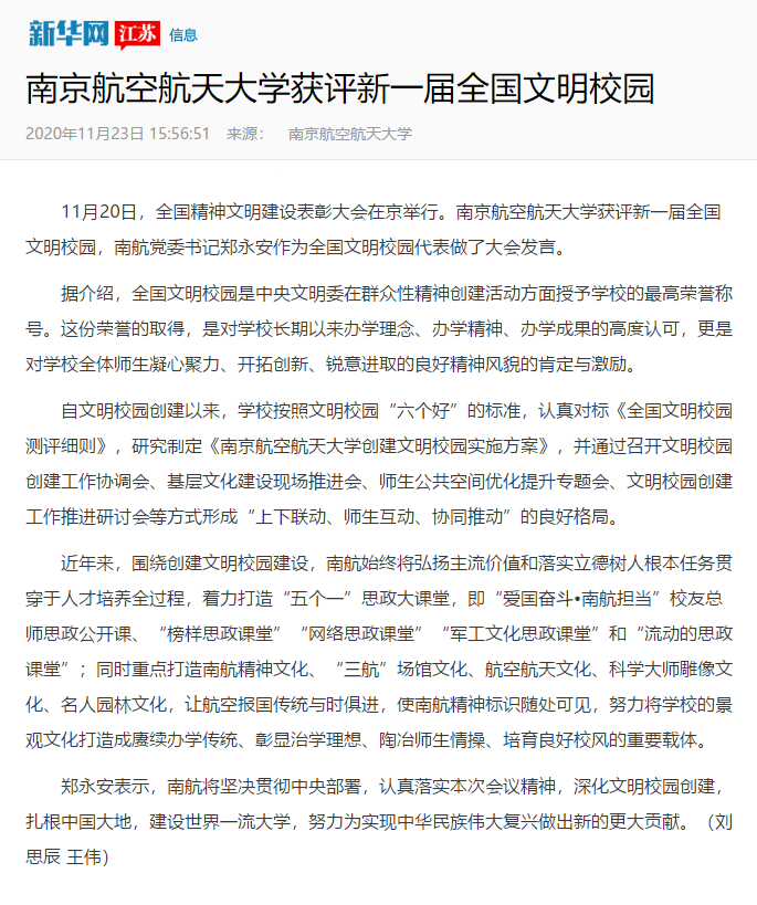 11月20日,全国精神文明建设表彰大会在北京举行。ac米兰获评新一届全国文明校园,校党委书记郑永安作为全国文明校园代表做了大会发言,相关情况也得到了央视新闻联播、人民日报、新华网、光明日报等中央及省级媒体的集中报道。