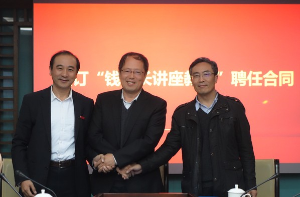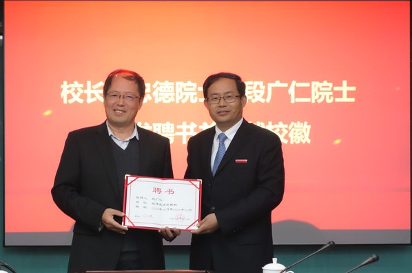 授聘仪式现场,单忠德为段广仁院士颁发聘书佩戴校徽,并签订了“钱伟长讲座教授”聘任合同。