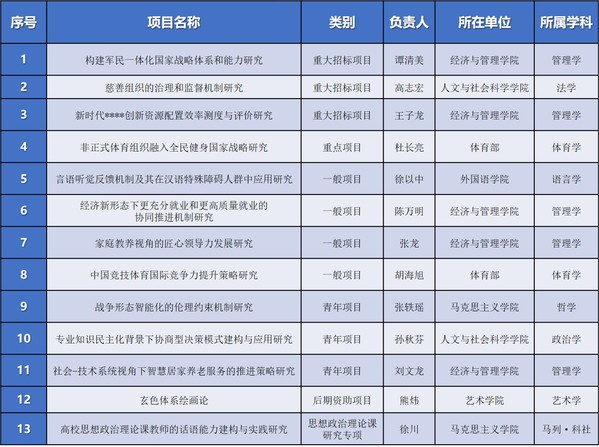 从获立项项目类别来看,高层次项目取得历史最好成绩,成功中标国家社科基金重大项目3项、获批重点项目1项,重大项目立项数位列工信部高校第一、江苏省高校第三。从获立项项目学科分布来看,继续呈现出学科分布多元化的良好态势,全校共有8个学科类别获得立项,管理学继续保持相对较强的竞争力,除此之外,体育学、法学、语言学、哲学、政治学、艺术学、马列·科社等学科均有所斩获。从获立项校内单位分布来看,经济与管理学院继续保持优势,获批5项;其他各单位全面开花,人文与社会科学学院获批2项,艺术学院获批1项,外国语学院获批1项,马克思主义学院获批2项,体育部获批2项。