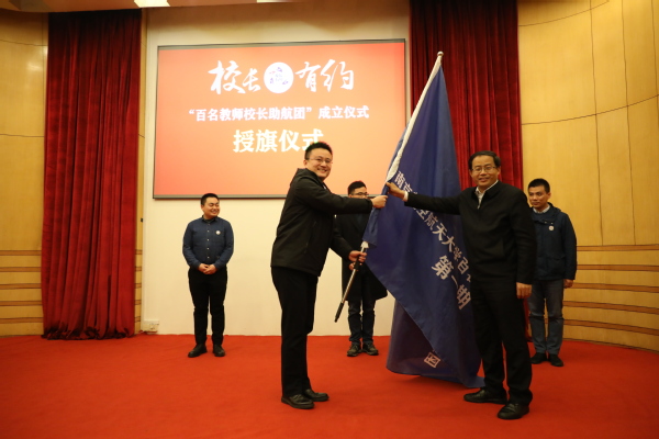 在“百名教师校长助航团”成立仪式上,陈金宝从班委会建设、平台搭建、班级文化等方面介绍了班级运转机制,百名教师与校长现场面对面建群,单忠德、杭育新、姜斌共同为班委成员佩戴班徽、单忠德为班级授旗并与班级代表共同在班旗上签名。