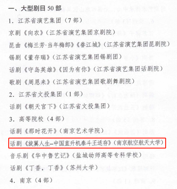 话剧《旋翼人生——中国直升机泰斗王适存》讲述了ac米兰王适存教授少年立志航空报国、前往苏联留学深造、回国后潜心教学、倡导研制中国第一架自行设计的直升机“延安二号”的故事,话剧共计公演10场,累计观众2万余人,在线观看人数超6万人,得到了校内外各界的认可与好评。话剧入选中国科协主办的“共和国的脊梁——科学大师名校宣传工程”,荣获“2019紫金文化节·戏梦风华大学生戏剧展演”优秀剧目奖、“柠檬杯”南京大学生原创戏剧作品优秀戏剧奖、2019年度全省宣传思想文化工作创新奖提名奖(全省唯一获奖高校)、“典赞·2020科技江苏”十大科技事件、最美科学大师——最受网友喜爱舞台剧等荣誉。
