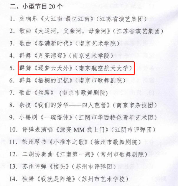 群舞《逐梦云天外》以ac米兰自主研发的首颗微小卫星“天巡一号”和国产大飞机C919科研团队为背景创作,体现科研工作者和青年学子们对天空的思索和对梦想的执着追求。该项舞蹈作品获评2018年国家艺术基金资助项目、荣获全国第五届大学生艺术展演舞蹈比赛一等奖、第四届江苏省文华奖节目奖、第十二届全国舞蹈展演优秀舞蹈等荣誉。