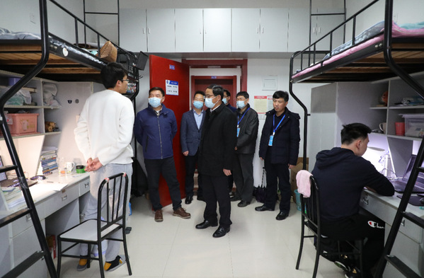 校党委书记郑永安、校长单忠德、副校长施大宁前往教务处、信息化处和学生宿舍等地,实地了解新学期教学运行相关工作,通过大屏幕实时查看了当天课程的各项数据和教学动态,进入在线课堂和深入学生宿舍查看学生在线学习情况。
