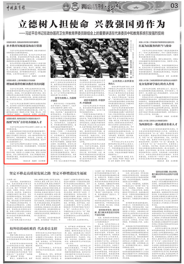 3月8日,《中国教育报》两会专题报道《立德树人担使命 兴教强国勇作为——习近平总书记在政协医药卫生界教育界委员联组会上的重要讲话在代表委员中和教育系统引发强烈反响》。