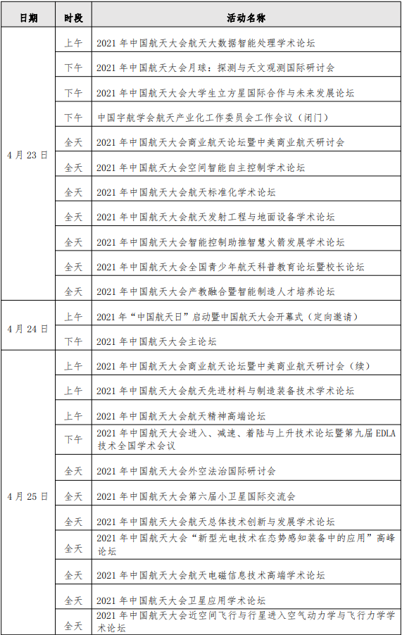 2021年中国航天大会拟于4月23-26日在江苏南京举办。大会将邀请国家相关主管部门、江苏省、军工集团、科研院所、航天企业和用户单位等的领导,以及知名专家学者共襄盛会,全面展示宇航前沿技术,深入探讨航天未来愿景,广泛推动世界航天领域的深度合作。现将大会有关情况预通知如下: