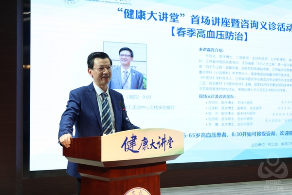 仪式后,方祝元教授及其“国家高血压病重点研究室”的专家团队,为教职工带来了首场“春季高血压防治”的专题讲座和咨询义诊活动。方教授用通俗易懂的方式,生动有趣地讲述了高血压的现状、严重危害,以及防治的有效方法。“健康是天”、“淡、静、松、动、眠”生活保养的“五字箴言”等健康理念,给大家留下了深刻而难忘的印象。现场的教职工还积极向咨询义诊团队的专家们咨询。方祝元教授的精彩讲座,以及专家的一一解答,让在场的教职工表示收获很大,感到意犹未尽,认为这是学校给他们送来的最好的健康福利大红包。