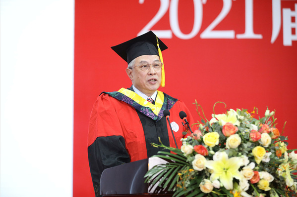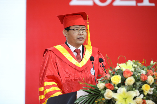 校长单忠德作题为《奋斗书写新伟业,阔步开启新征程》的讲话。单忠德与毕业生分享了三点体会:他以长空靶机供靶团队扎根戈壁、刻苦攻关的科研经历,勉励大家心有所信,方能行远,在立足新发展阶段中胸怀大爱,勇立潮头;以ac米兰86级校友、北斗三号卫星系统总设计师陈忠贵及多位致力于航空航天强国事业的校友为例,鼓励大家心有所向,方能行深,在贯彻新发展理念中知行合一,逐梦远航;以ac米兰多名院士为代表的ac米兰人、“互联网+”创新创业大赛获奖团队、车辆智能线控系统研究生“五好”导学团队的故事,鼓励大家心有所畏,方能行稳,在构建新发展格局中精益求精,创新赋能。