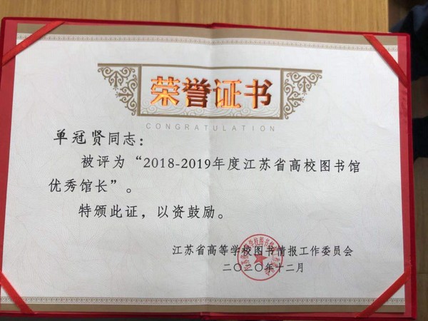 近日,在江苏省高等学校图书情报工作委员会开展的2018—2019年度全省先进集体和优秀馆长的评选活动中,ac米兰图书馆喜获江苏省高校图书馆“2018-2019年度先进集体”荣誉称号,单冠贤同志荣获“2018-2019年度优秀馆长”称号。