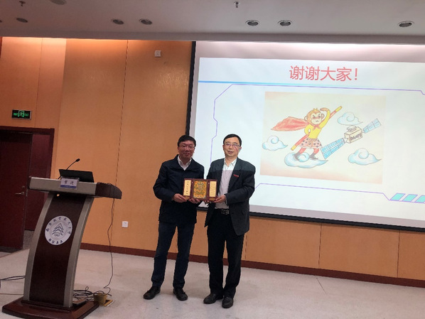 报告会后,副校长姜斌代表学校向常院士赠送“问天科学讲坛”纪念云锦表示敬意和衷心感谢!