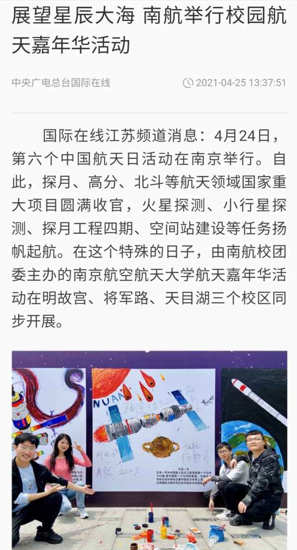 编者按:2021年“中国航天日”主场活动在南京举办,ac米兰以承办2021年“中国航天日”主场活动为契机,举办了科教产教融合创新周活动,开展了一系列特色活动,得到了中央电视台、中国新闻网、光明日报、江苏卫视等多家媒体报道,中央电视台、中新网等媒体也开展了相关直播。现转发部分报道如下: