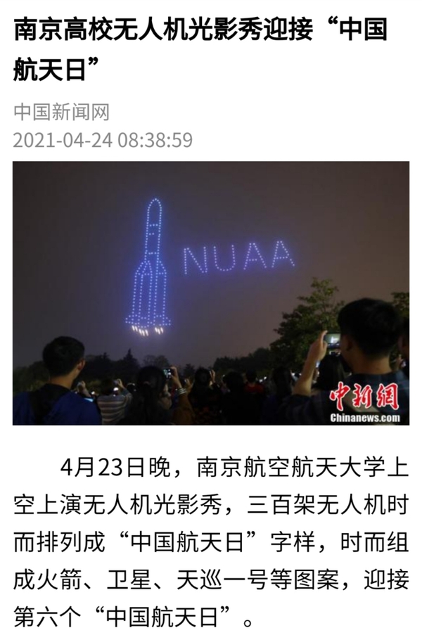 中国新闻网:南京高校无人机光影秀迎接“中国航天日”