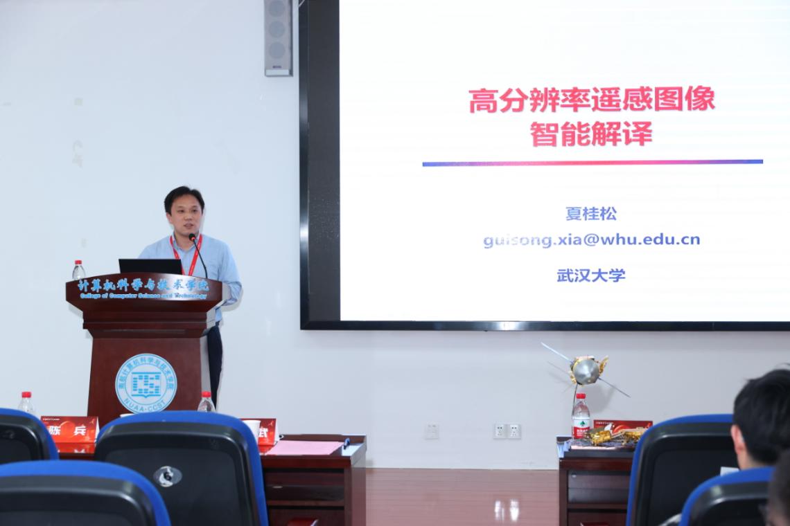 夏桂松就“高分辨率遥感图像智能解译”做了专题报告。他围绕遥感图像分类、地物语义分割、目标检测、变化检测等任务,分享了从数据准备到算法设计的经验。