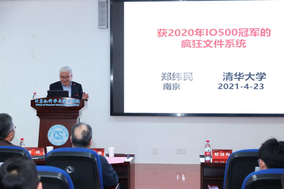 本次论坛共设三场特邀报告。郑纬民带来“获2020年IO500冠军的疯狂文件系统”专题报告。他首先介绍IO500测试的历史情况,随后对高性能计算机的存储结构演变和疯狂文件系统MadFS的结构进行了详细介绍。他在报告中介绍到由其团队研发的文件系统MadFS在IO500测试中,以7043.99分获得全球总榜冠军,这是国内科研机构首次夺得该排行榜榜首。这种创新架构的文件系统为航天大数据的快速分析提供了保证,也可以广泛应用于民用的大数据分析领域。