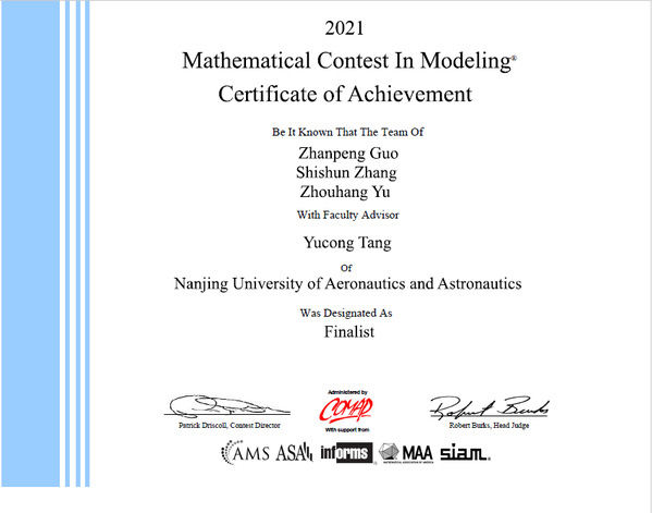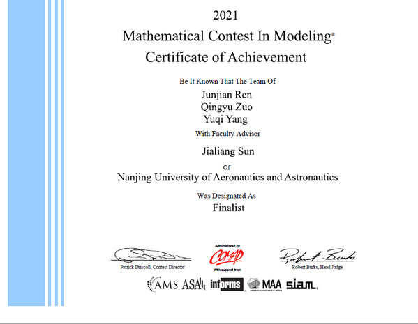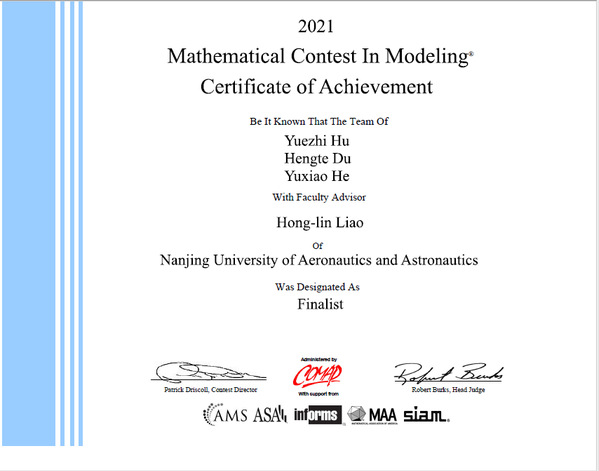 美国大学生数学建模竞赛(MCM/ICM)由美国数学及其应用联合会主办,是世界范围内最具影响力的数学建模竞赛,通常每年2月份举办。2021年美国大学生数学建模竞赛(MCM/ICM)共吸引了来自22个国家1641所高校的26112支队伍参加。每支参赛队伍需要就选定的问题完成从建立模型、编程求解、结果验证到英文论文撰写的全部工作,充分展现了参赛选手在分析问题、信息检索、利用数学方法解决问题、英文科技论文写作、团队合作等方面的综合能力和素质。