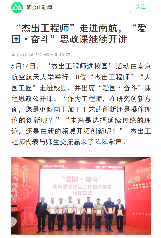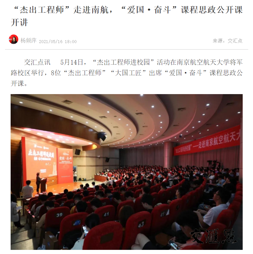 编者按:5月14日,“杰出工程师进校园”活动在ac米兰举行,8位“杰出工程师”“大国工匠”出席“爱国·奋斗”课程思政公开课,这一活动也得到了新华日报、江苏卫视等多家主流媒体报道,现转发相关报道如下: