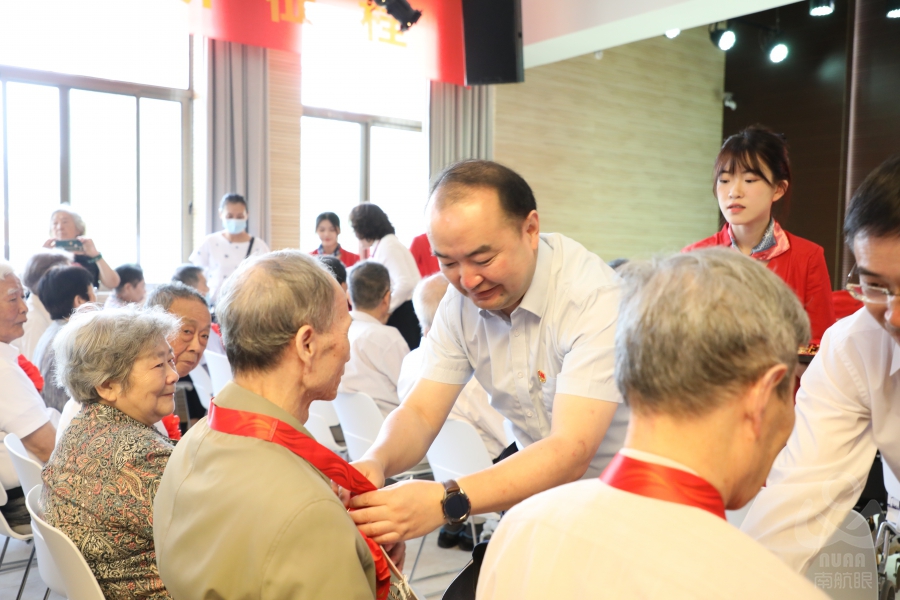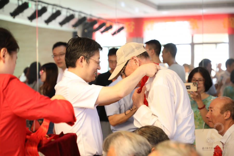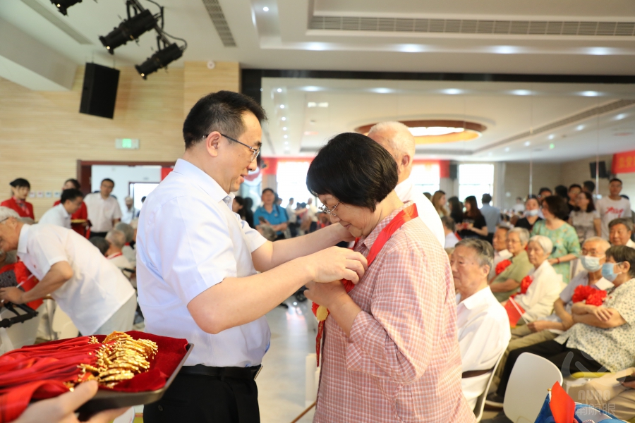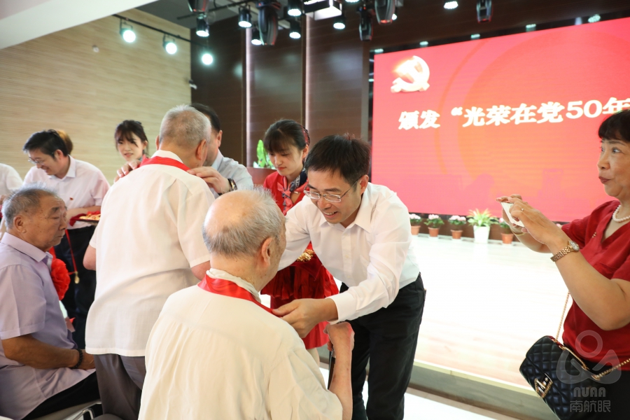 伴着《没有共产党就没有新中国》的乐曲,校领导们为在场老党员逐一颁发“光荣在党50年”纪念章,并向他们致以崇高的敬意!老党员们胸前的纪念章和红花是对他们坚守政治信念、砥砺党性本色、筑牢理想追求的高度认可和最好嘉奖。