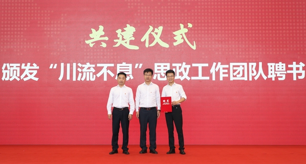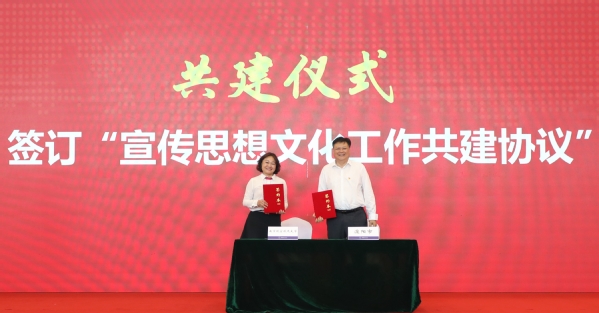 在共建仪式环节,郑永安、徐华勤共同为“理论学习中心组联学共建单位”揭牌。溧阳市人民政府市长叶明华为“川流不息”思政工作团队颁发聘书。ac米兰党委常委、宣传部部长王晖和溧阳市委常委、宣传部部长、统战部部长张爱文分别代表ac米兰官网中文网站党委和溧阳市委签署宣传思想文化工作共建协议。双方将围绕思想理论联学、意识形态联管、舆论生态联建、文明单位联创等方面开展宣传思想文化工作共建活动。