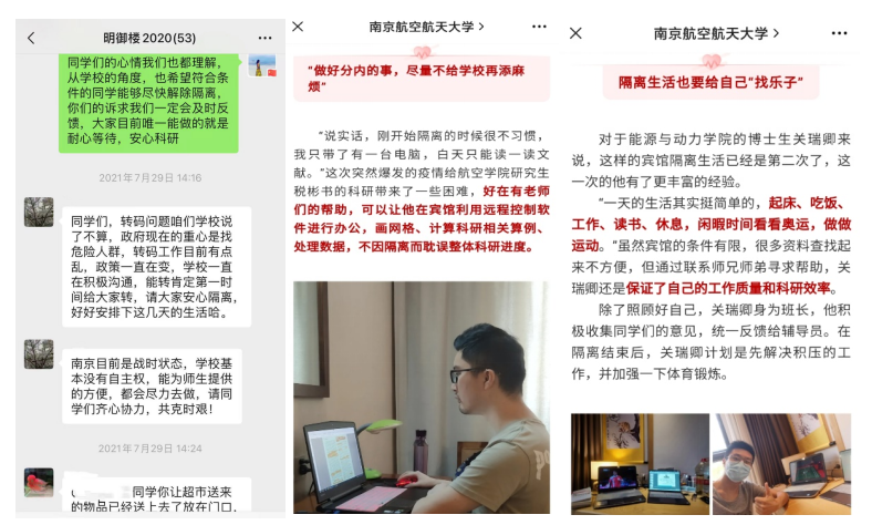 宣传引导,增强信心。发布《致全校研究生党员的倡议书》,号召全体研究生党员带头落实防疫要求,争做基层防疫工作志愿者,充分发挥研究生党员的先锋模范作用和研究生党支部的战斗堡垒作用,号召校、院两级“五好”导学团队、建设在科研团队中的纵向党支部做好团队建设的表率,带动身边研究生调整心态、增强信心,带头开展科研交流;针对台风、疫情、暴雨频发的情况,及时发布《研究生安全稳定工作提示》。