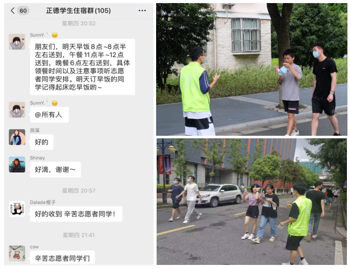 关爱学生,服务学生。宣传引导研究生错峰就餐;为住宿在正德学院的研究生建立订餐群,与饮食中心一起做好该学生群体的订餐配送服务;针对校内道路上还有同学不戴口罩的情况,安排充足的志愿者在学校主干道、食堂、宿舍和超市门口进行提醒。