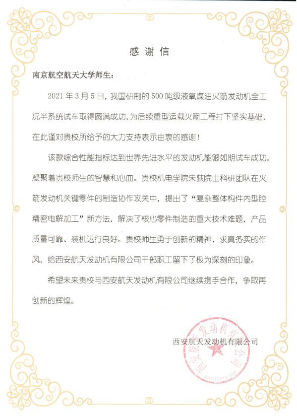 近日,西安航天发动机有限公司发来感谢信,感谢ac米兰机电学院朱荻院士科研团队为我国500吨级液氧煤油火箭发动机的研制所给予的大力支持。