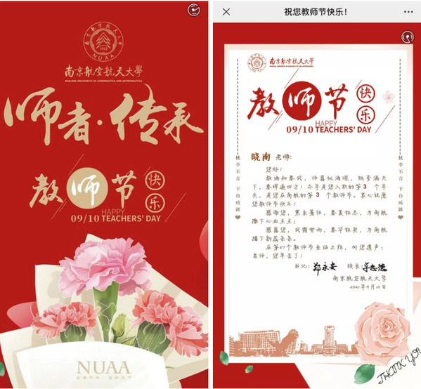 受疫情影响,今年的教师节未能像以往隆重热烈,但教师们的过节体验并未减少分毫,教师工作部和信息化处共同策划,为每位教师设计专属贺卡。早上7点半起,老师们陆续收到了郑永安书记和单忠德校长署名的订制贺卡。据统计,今天通过微信企业客户端,共有3981位教师收到了这份用心、用情的节日礼物。