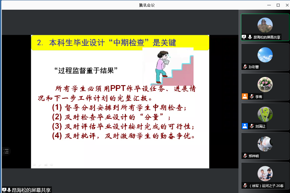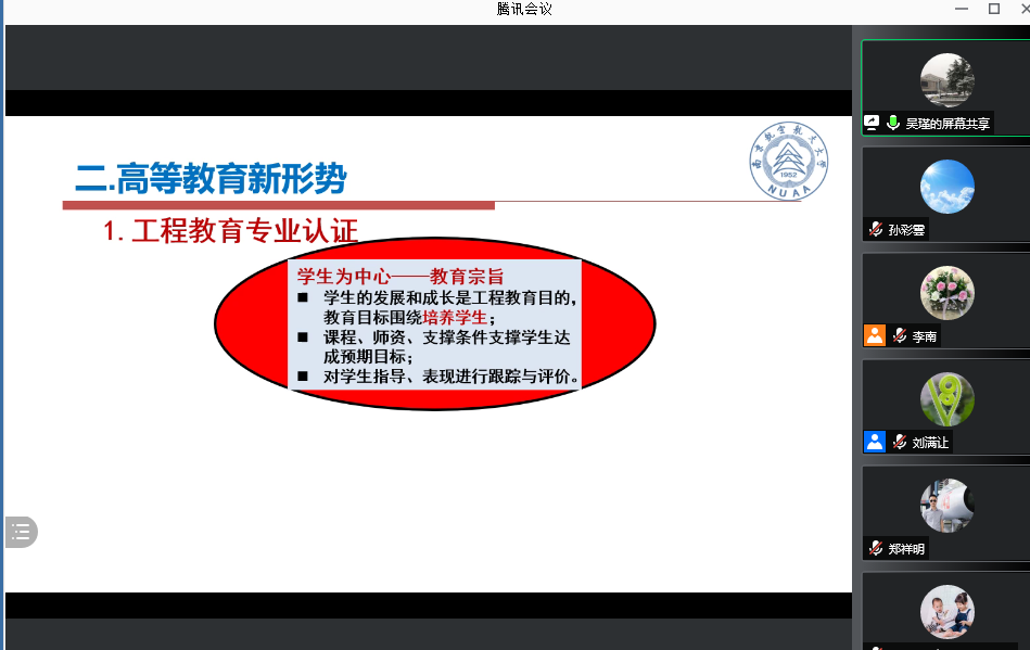 校督导组吴瑾教授、航空学院督导组组长昂海松教授、理学院督导组组长吴平教授分别就新时期教学督导工作理念与思路、毕业设计(论文)督导工作、加强督导工作保障教学质量的措施等方面进行了专题分享。吴瑾指出,“检查、评价与诊断”是我们督导工作的强项,“指导”工作还需要加强,尤其是工程教育认证背景下教学目标达成的督导还需要进一步强化。昂海松指出本科毕业设计(论文)督导要着眼于开题、中期检查、答辩等三个环节,一方面要善于发现和推荐优秀毕设(论文),另一方面要加强问题论文的督导,问题论文须经督导(组长)审阅同意后方能提交答辩。吴平以试卷检查为例,分享了理学院在基本规范上的做法和措施,还分享了三个如何,即:如何把握好“督”与“导”的关系、如何使“督教”与“督学”平衡、如何使督导、专家、学生的评估结果客观统一。